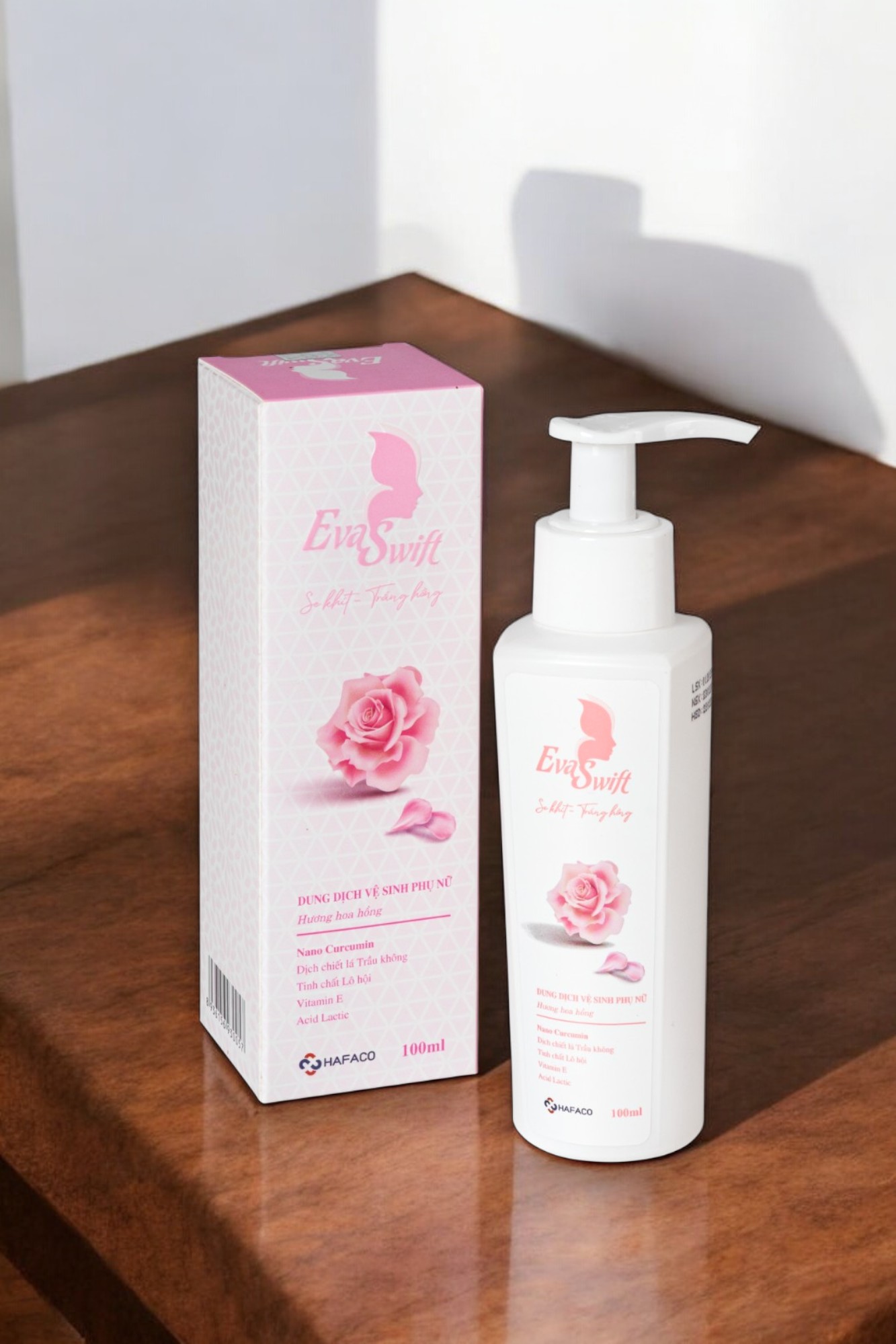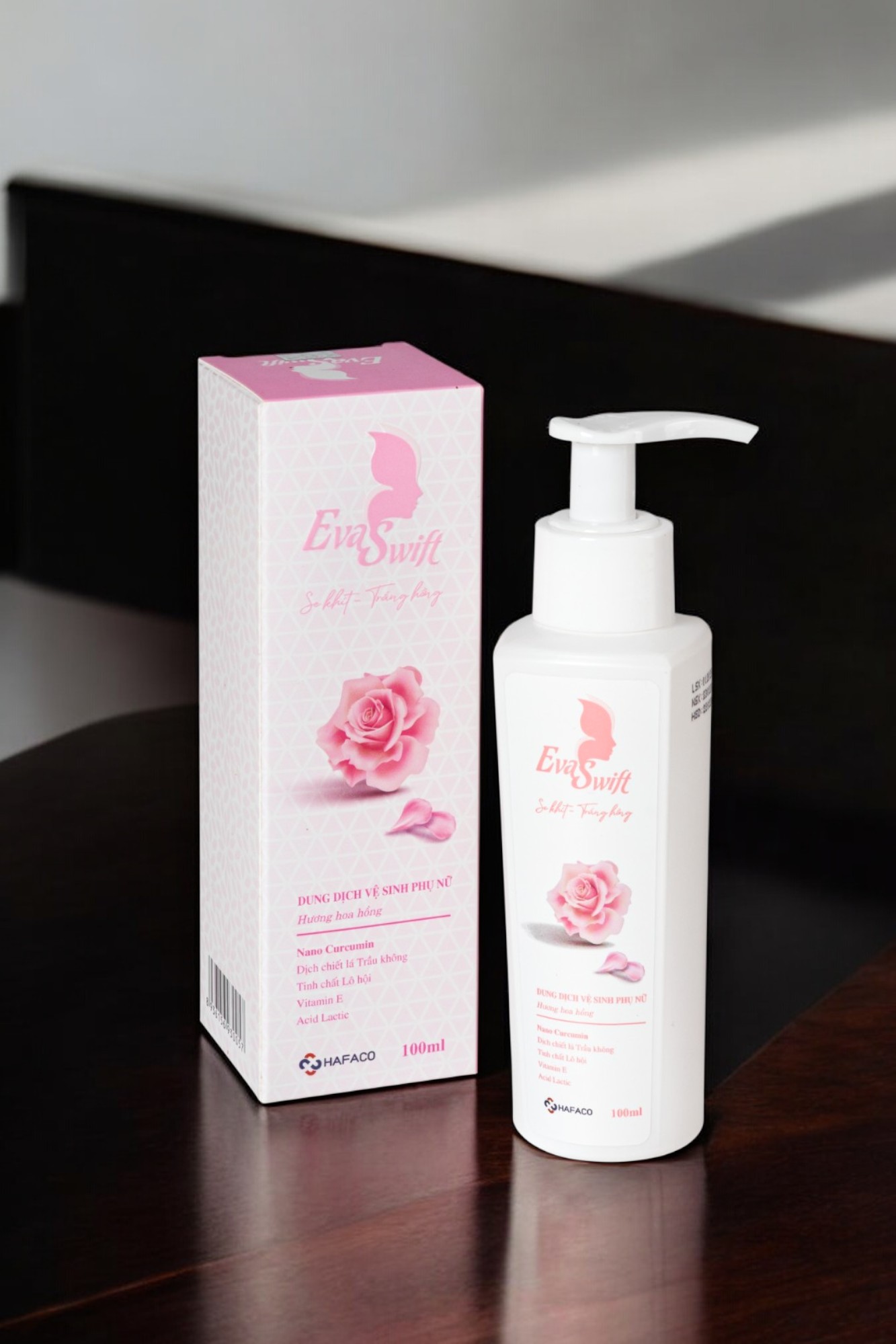 EvaSwift là sản phẩm chuyên dùng để chăm sóc và vệ sinh vùng kín với Ba thành phần chính là tinh chất Lô Hội, dịch chiết lá Trầu Không và tinh chầt Nghệ đã được chuyển dạng nano (Curcumin nano) có tác dụng hấp thu lên đến hơn 90%. Đây là các thành phần tự nhiên chiết xuất từ thảo dược kết hợp khoa học với Vitamin E, Acid lactic và không chứa xà phòng có tác dụng làm sạch nhẹ nhàng, làm mềm, làm sáng hồng vùng niêm mạc một cách tự nhiên, giữ được sự cần bằng sinh lý của niêm mạc vùng kín.